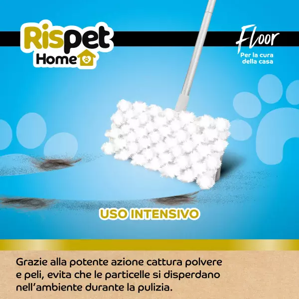 Rispet Floor è il panno per la pulizia a secco dei pavimenti, ideale per case con animali domestici. Grazie agli innovativi ciuffi 3D ad alta densità, cattura e trattiene efficacemente polvere, sporco e peli di animali grazie alla tecnologia 3D Hair & Dust Lock, evitando che le particelle si disperdano nell’ambiente durante la pulizia.