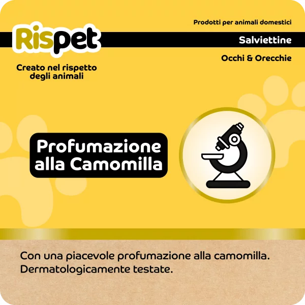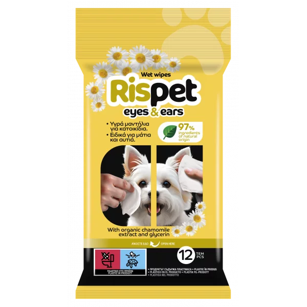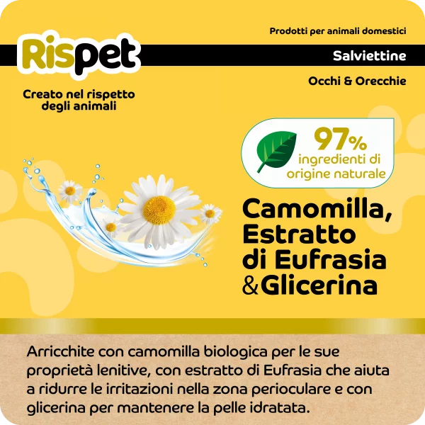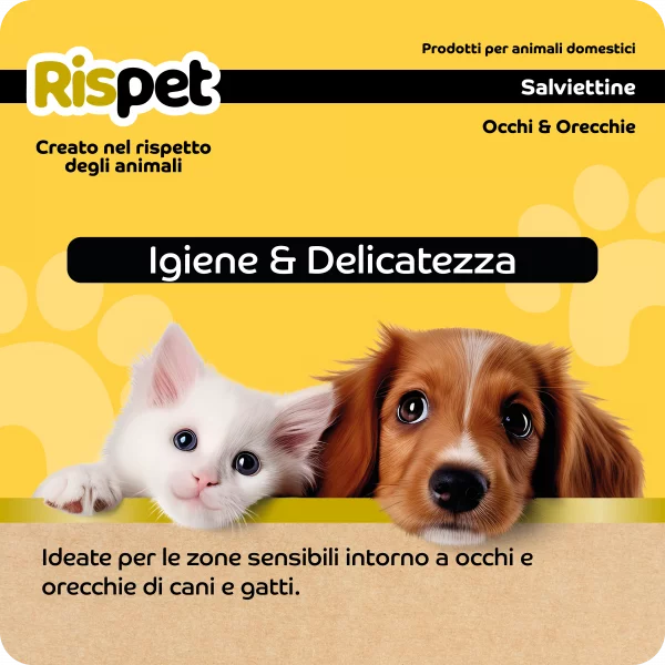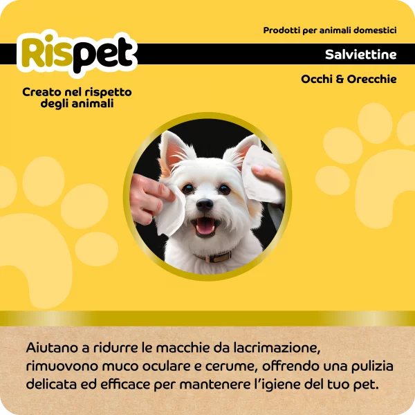 Salviette umidificate studiate per la pulizia delle zone sensibili intorno a occhi e orecchie di cani e gatti.
