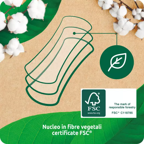 Salvaslip con filtrante in cotone anatomici distesi, per comfort e protezione quotidiana. Con filtrante in 100% cotone per una protezione igienica unica e nucleo assorbente composto da fibre di derivazione naturale e certificazione FSC™ (Licenza FSC™ C118785). Taglia Normal